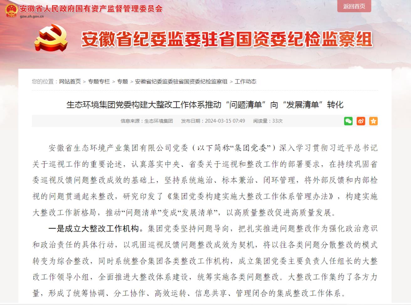 近日,安徽省國資委網站-安徽省紀委監委駐省國資委紀檢監督組專欄發布了《省生態環境集團黨委構建大整改工作體系推動“問題清單”向“發展清單”轉化》,以下為全文。