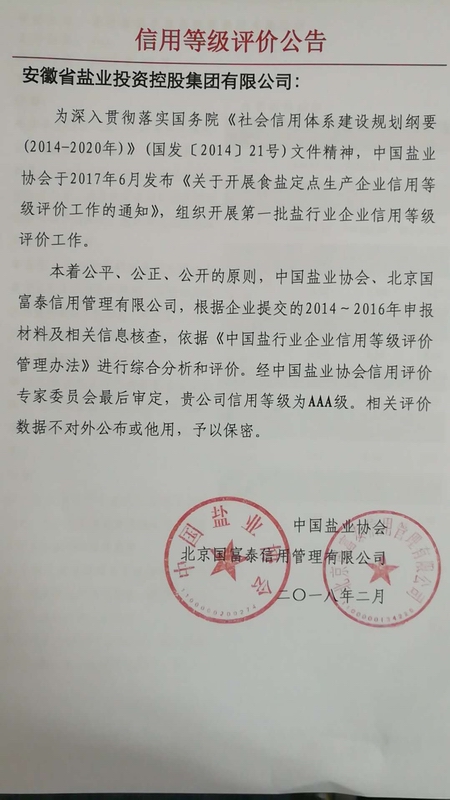 近期,集團公司在中國鹽業協會組織的鹽行業企業信用等級評價工作中,憑借良好的企業綜合素質、較強的經營狀況、廣泛的競爭能力,獲得了企業信用評級最高等級AAA級。
